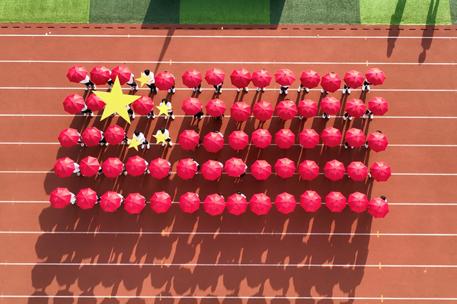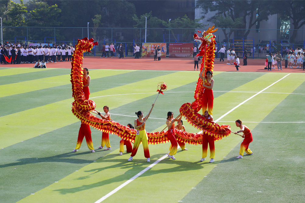 文体表演环节,舞龙、团体操、排舞表演依次上演。舞龙盘旋,栩栩如生;鼓点激昂,气势如虹。花扇开合,色彩变换;锦绣青春,尽在其中。最后,在《同爱同在》青春歌声中,520名华大学子活力共舞,寓意团结友爱、携手共进,共筑中华民族美好未来。