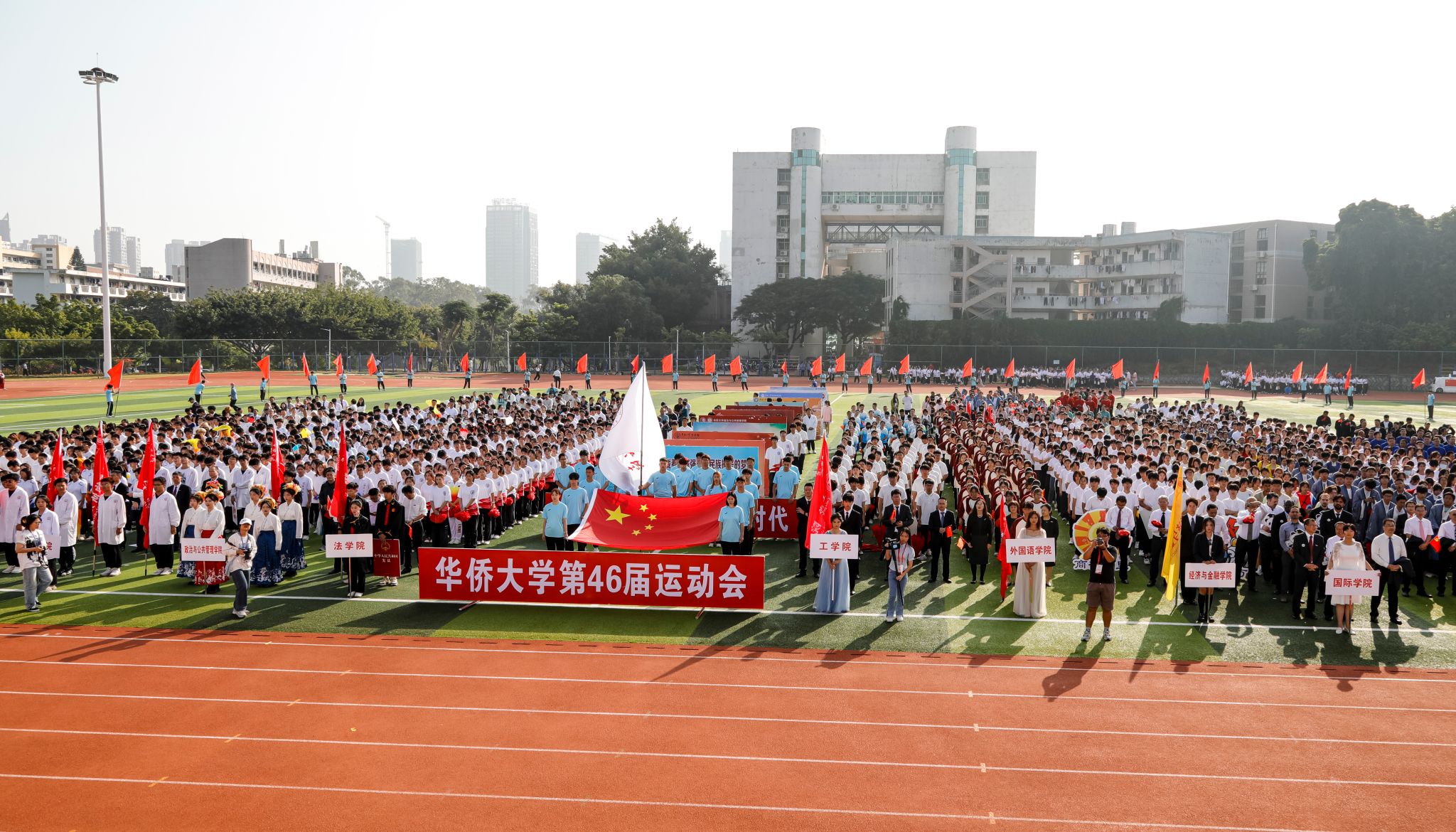 秋高气爽,惠风和畅。华侨大学第46届运动会泉州校区赛事11月3日上午在西区田径场开幕。726名学生和教工运动员将在两天时间里角逐跨栏、接力、长跑、短跑、跳高、跳远、铅球等19个田径项目的比赛。
