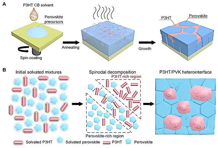 图为P3HT/PVK异质界面的形成。(A) P3HT/PVK原位制备示意图。(B)旋节线分解的演化模型。