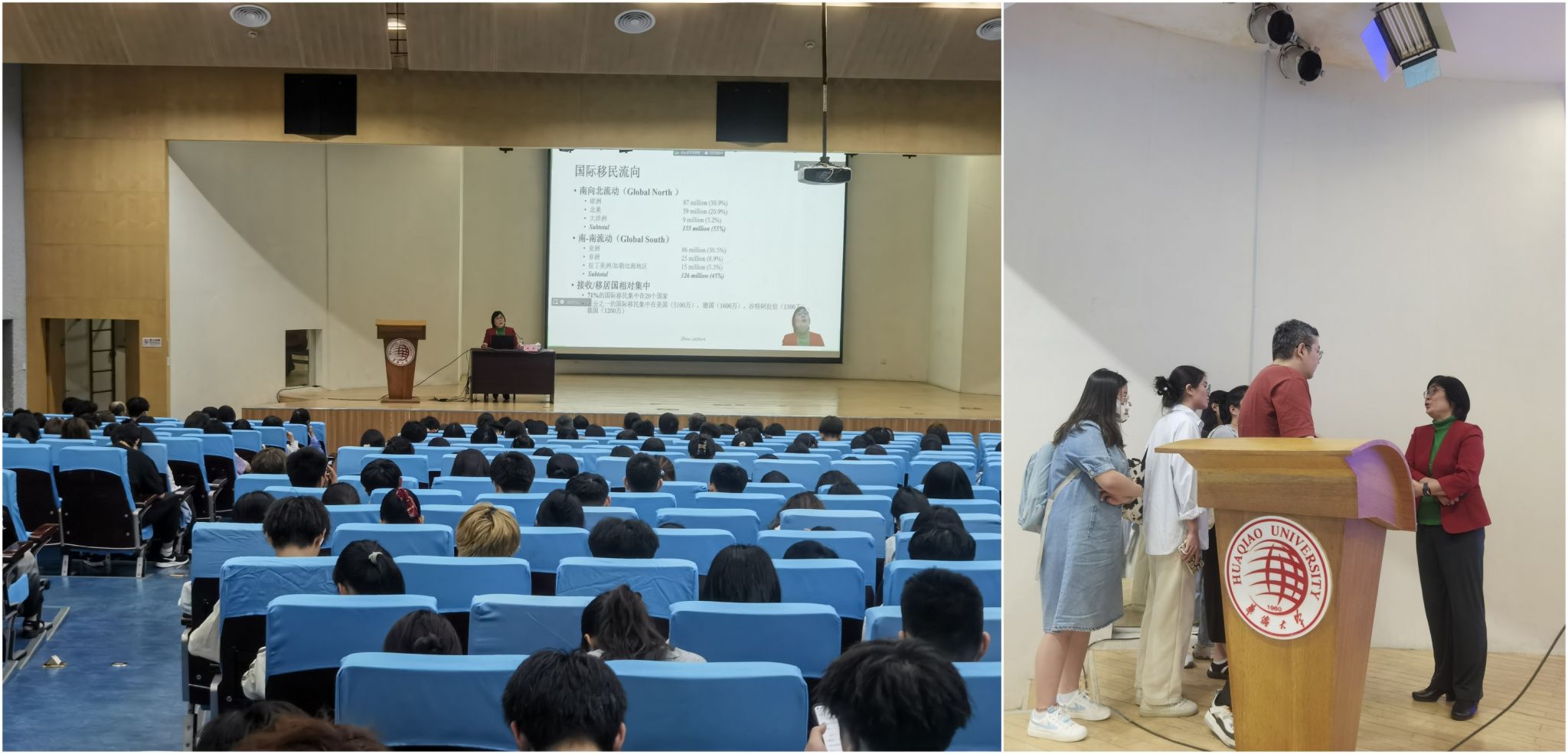 周敏还为我校近2000名大一学生讲授《侨史侨情》通识课程——“当代北美华侨华人社会的发展动态”。她回顾了美国华人社会的历史发展,阐述了美国华人社区的变迁。她特别指出,自1965年美国移民法改革以来,亚裔移民数量显著增加,其中华人移民呈现出显著的多元化趋势,不仅在来源地、社会经济背景上,也在居住模式上呈现出多样化的特点。她进一步分析了当代华裔人口的特征,以及华人社区在教育、职业和收入水平方面的社会经济地位,通过对比不同族裔的数据,强调了华人社区在教育成就和经济地位上的优势。在探讨北美华侨华人社会的发展趋势时,周敏特别提到了“华人聚居郊区”的概念,这是一类新兴的、以中产阶级为主的华人社区,它们在经济和社会组织方面展现出了与传统唐人街不同的发展模式。周敏指出,这些社区的发展不仅促进了族裔经济的多样化,还加强了社区组织的建设,有助于移民的社会融入和向上流动。