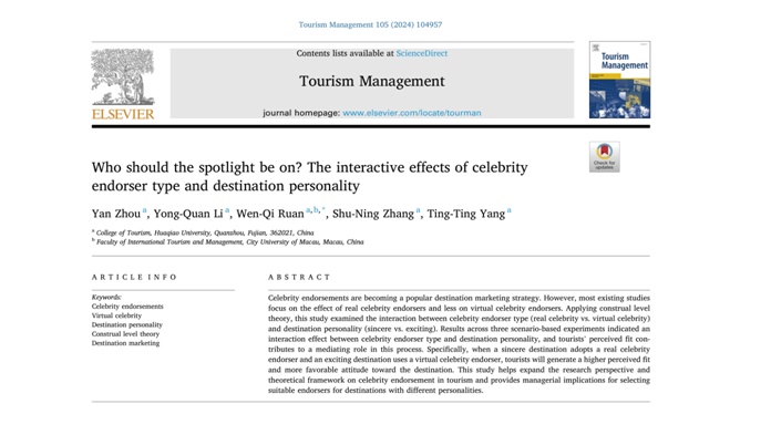 近日,我校旅游学院博士生周燕在国际旅游杂志《旅游管理》(Tourism Management)发表了“Who should the spotlight be on? The interactive effects of celebrity endorser type and destination personality”一文。