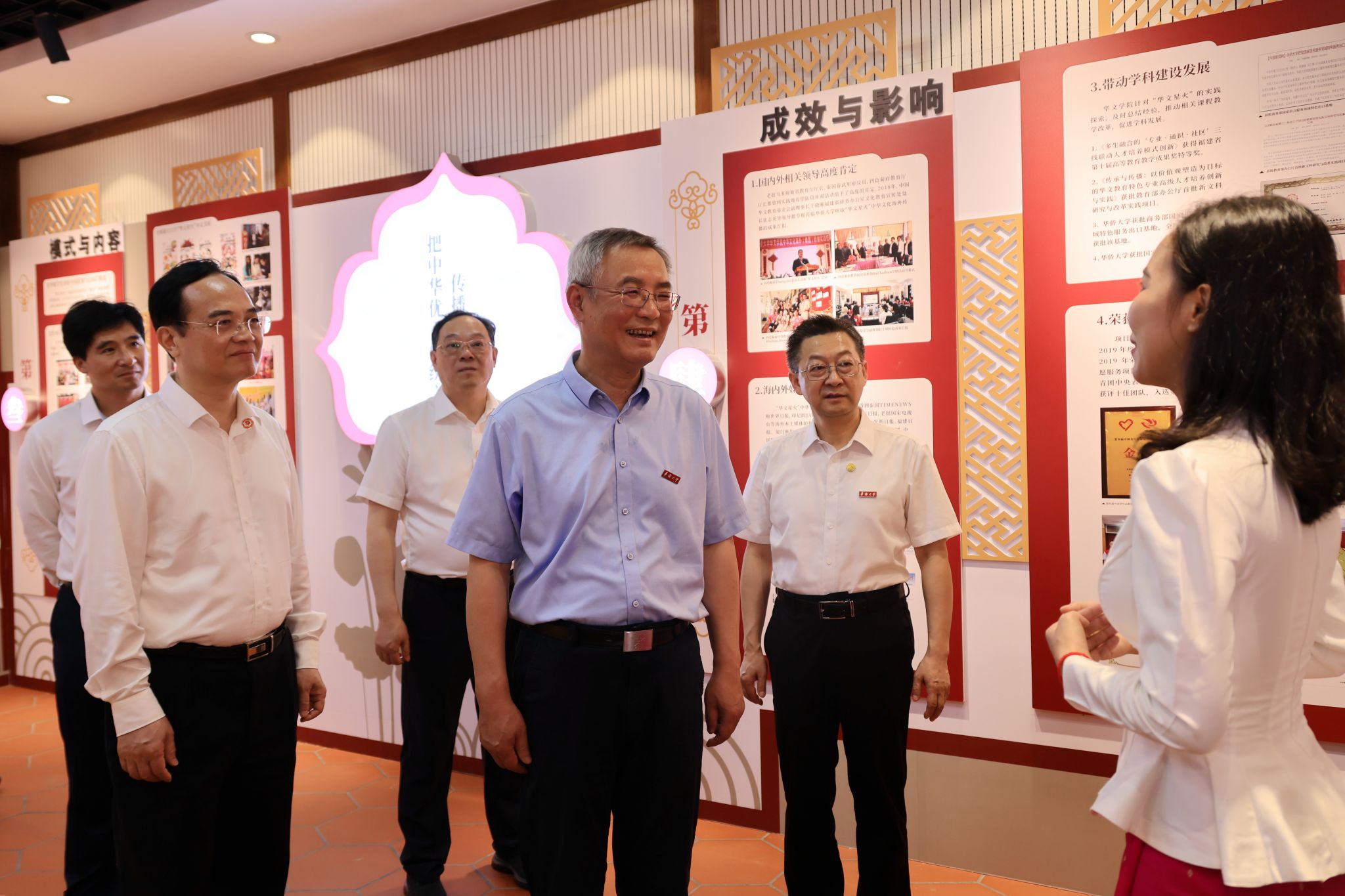 蔡达峰在华侨大学考察了中华文化海外传播工作,参观了海丝文化展览,看望了华侨大学民进会员代表并同大家合影留念。