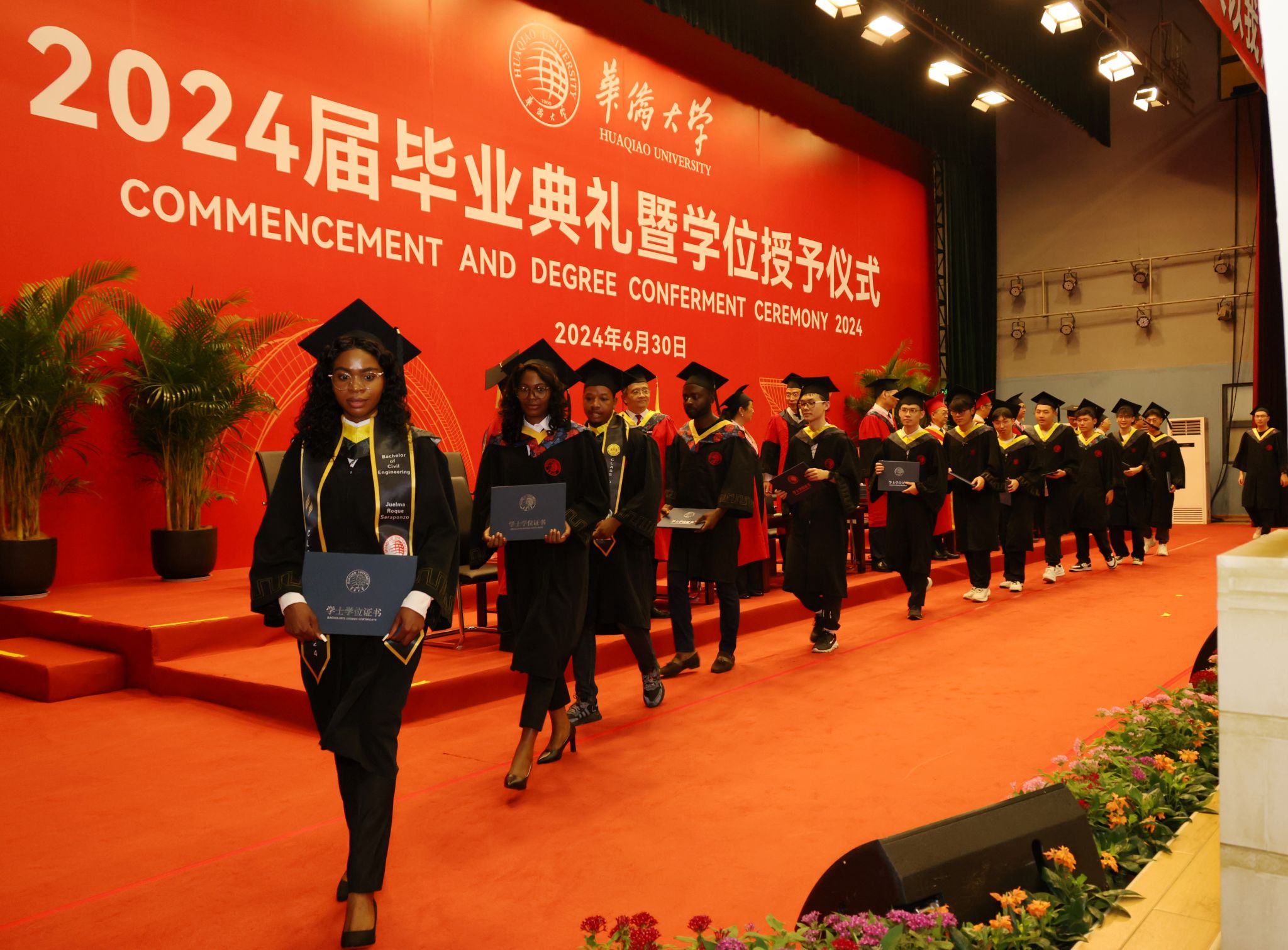 典礼暖场环节播放了学校为同学们精心制作的毕业MV、电子相册,毕业生原创的AI短视频等。一帧帧画面定格的是笑颜绽开的华大人,更是华大人青春记忆的最好模样。音舞学院民乐团的民乐合奏、港澳台侨学生的国风创意歌曲串烧、外国留学生的英文和泰文歌曲演唱、77岁印尼华人博士毕业生领衔演唱的《爱拼才会赢》闽南语歌曲以及《祖国不会忘记你》大合唱等……一首首动人的歌曲,带领同学们重拾美好校园时光,更是华大学子奋发向上精神和爱校爱国情怀的深情表达。