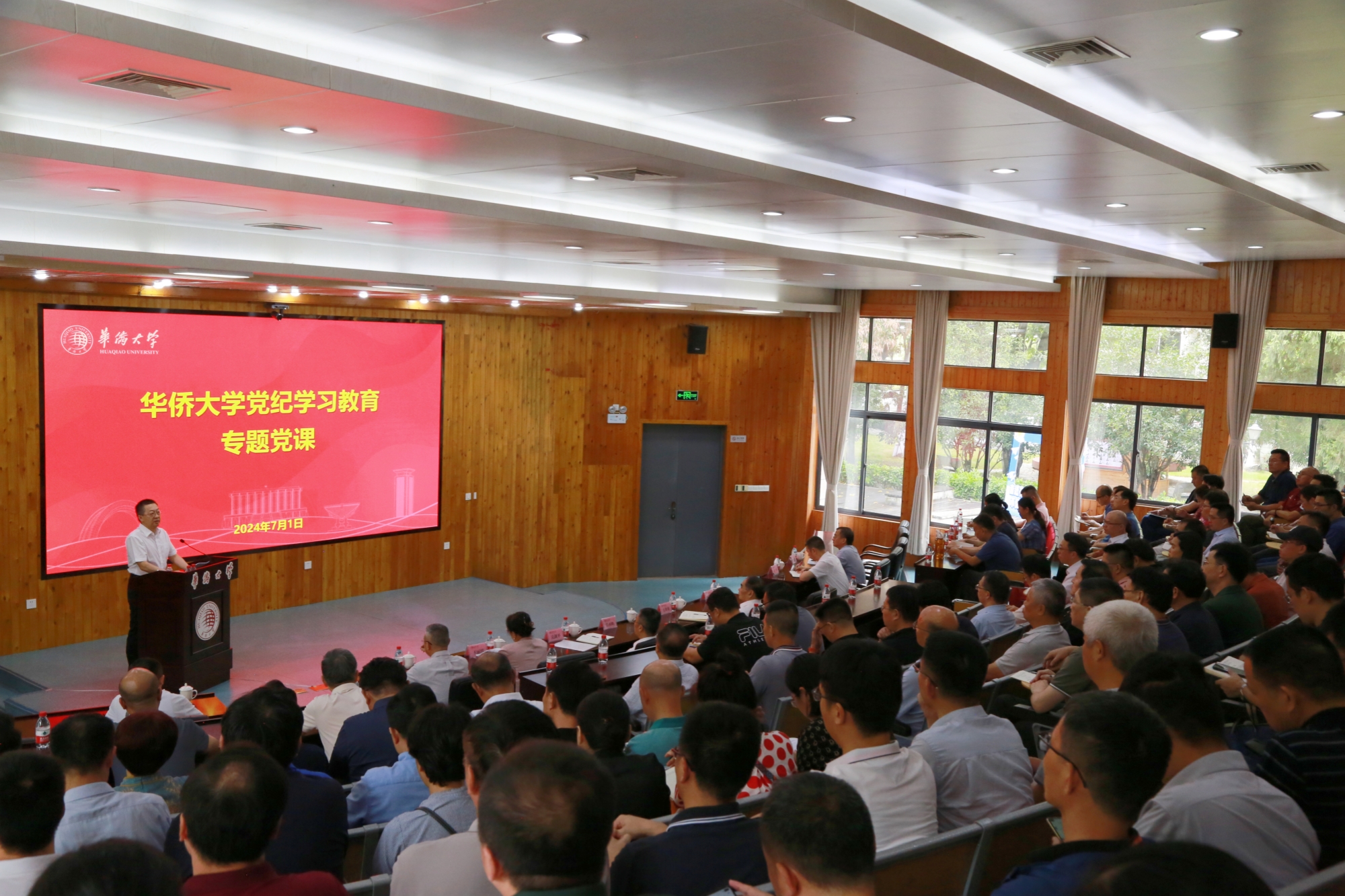 7月1日,校党委书记徐西鹏在庄为烜报告厅讲授党纪学习教育专题党课。校长吴剑平主持。