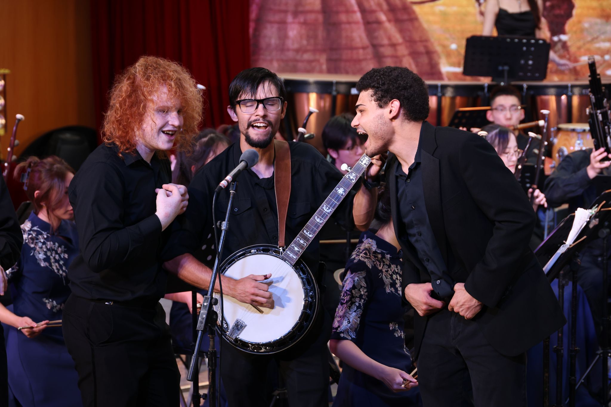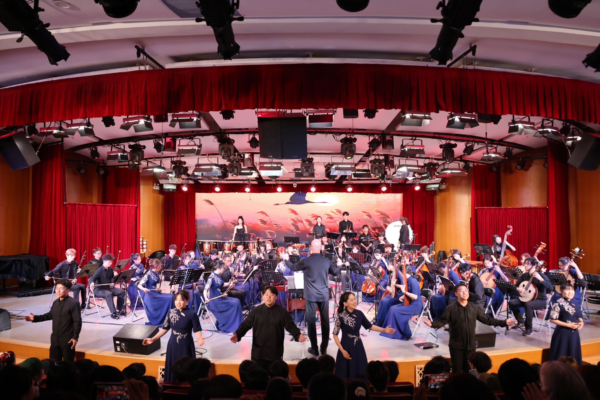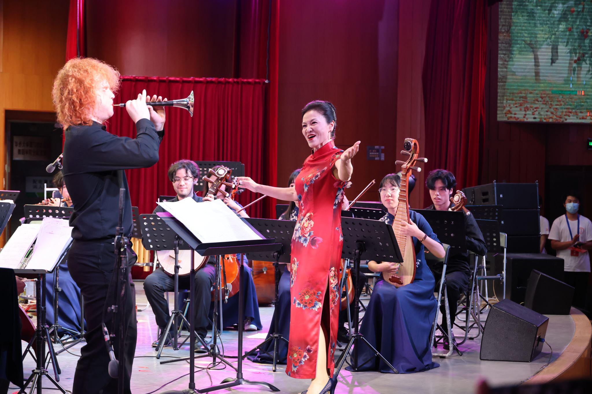 当晚演出中,来自美国中田纳西州立大学、卡尔顿学院学生用所学的笛子、唢呐、笙、箫、二胡、古筝等中国传统乐器与华大学子共同演绎了中国北方民歌小合奏《打枣》、美国蓝草音乐代表《亲爱的老迪克西》与民乐合奏曲《喜洋洋》等11首乐曲。表演者以精湛的技艺、饱满的热情,赢得了现场观众的阵阵掌声与喝彩声。