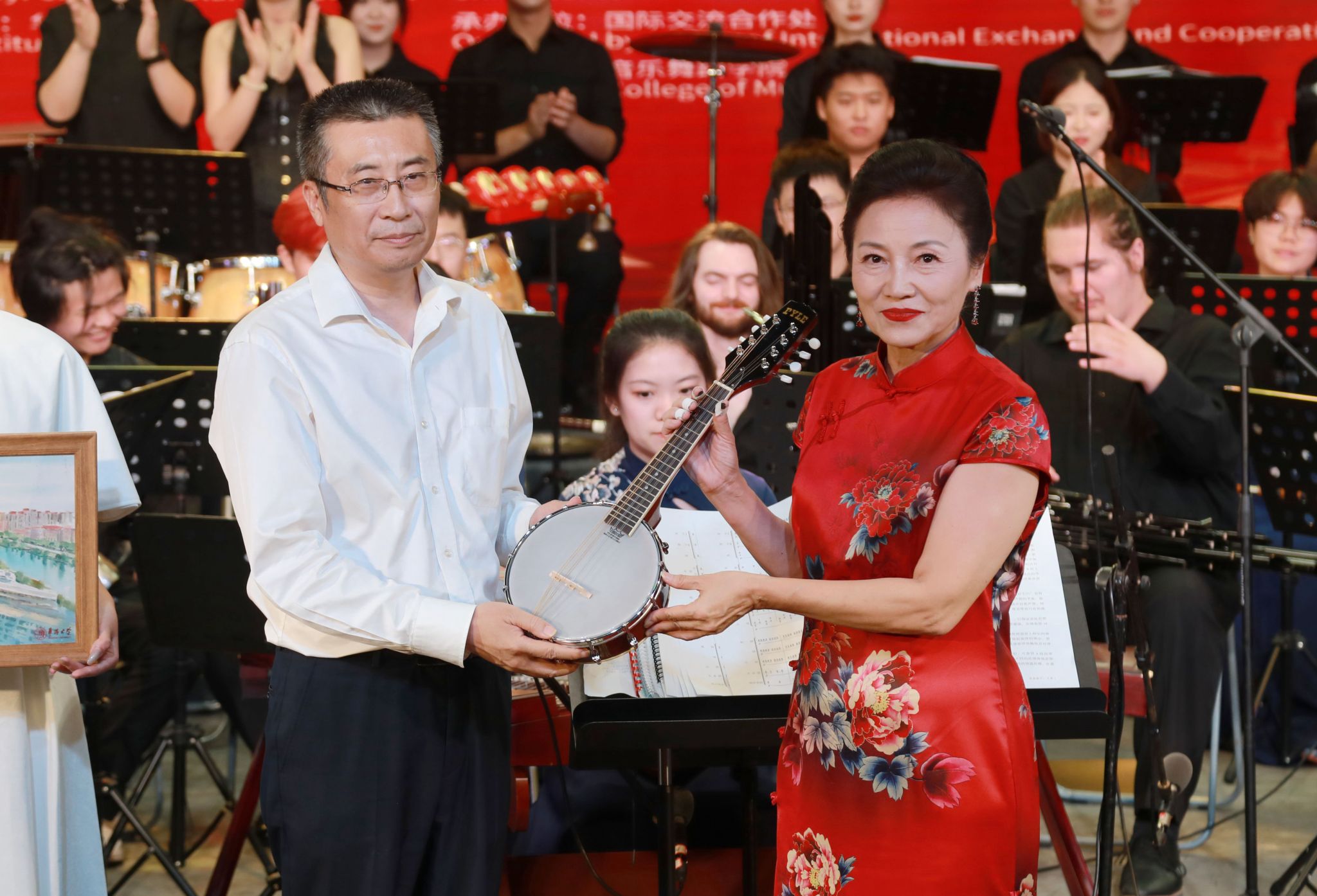 当晚,校长吴剑平、副校长王秀勇等出席汇报音乐会。吴剑平并与交流营带队教师、美国中田纳西州立大学中国音乐文化中心主任韩梅互赠纪念品。