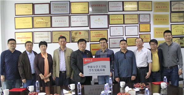 彭霈向泉州天地星电子有限公司颁发华侨大学工学院学生实践基地牌匾。魏腾雄以及泉州天地星电子有限公司部分管理人员同时受聘为华侨大学工学院校外指导老师。