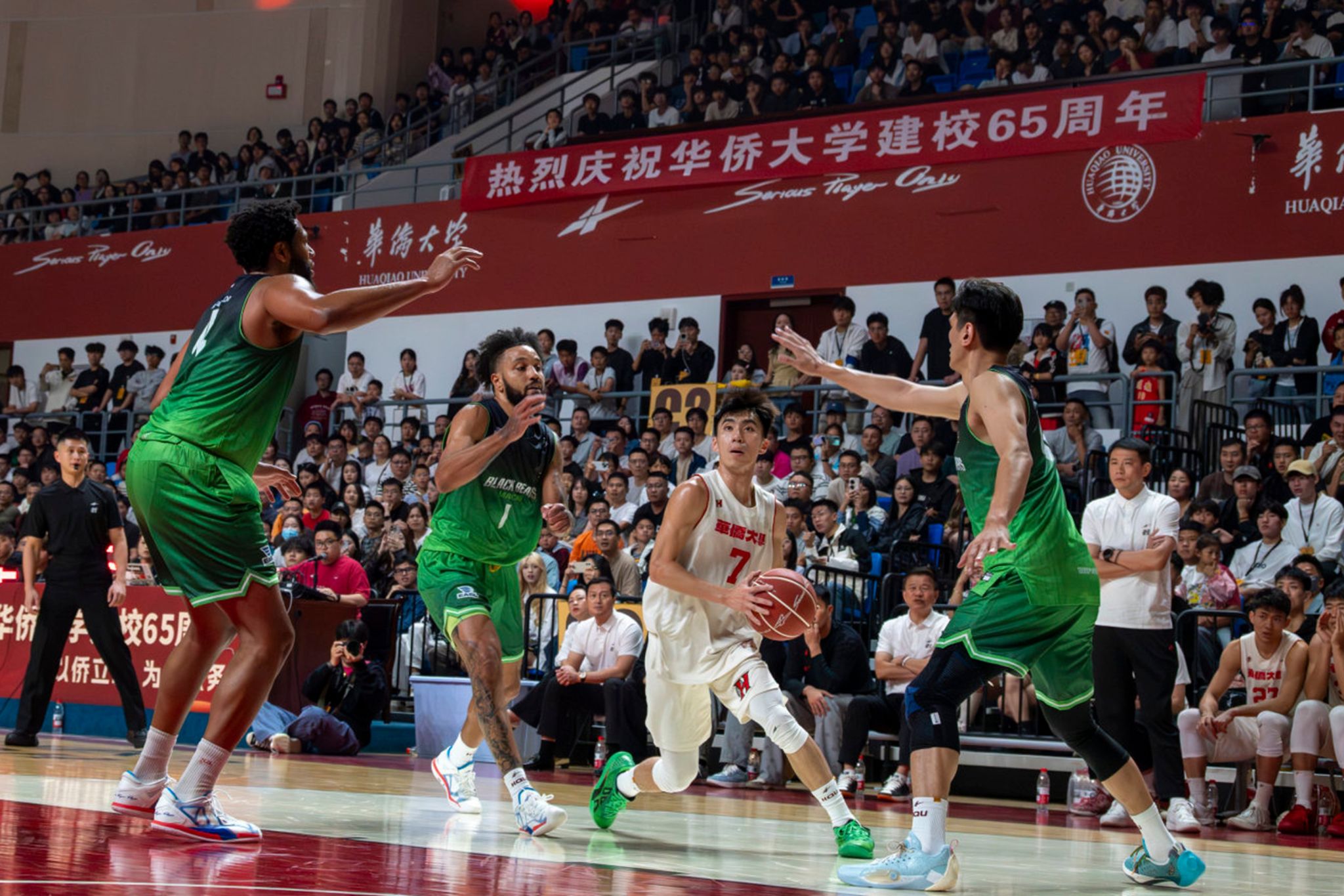 今年是华侨大学建校65周年。华大男篮11月1日晚在福建泉州主场迎战澳门黑熊队。双方为师生校友奉献了一场精彩的比赛,华大男篮最终以83比81逆转获胜,将专属华园的欢乐之夜推向高潮。