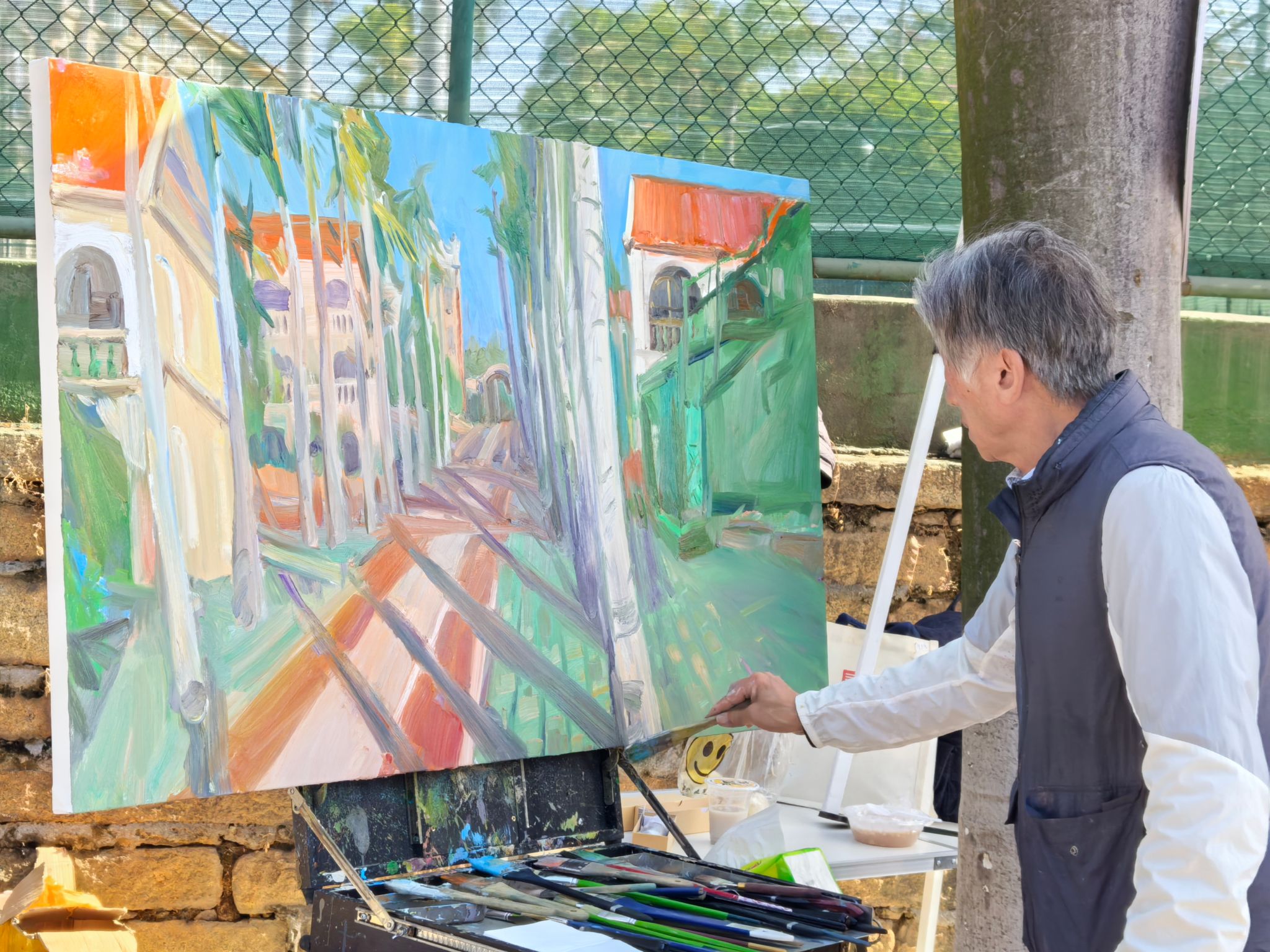 在华文学院,范迪安现场创作油画作品《侨校之光》,以精湛笔触生动呈现嘉庚风格建筑与校园人文底蕴。活动现场,来自毛里塔尼亚、马达加斯加、泰国、印度尼西亚等“一带一路”共建国家的留学生全程观摩创作并参与交流。
