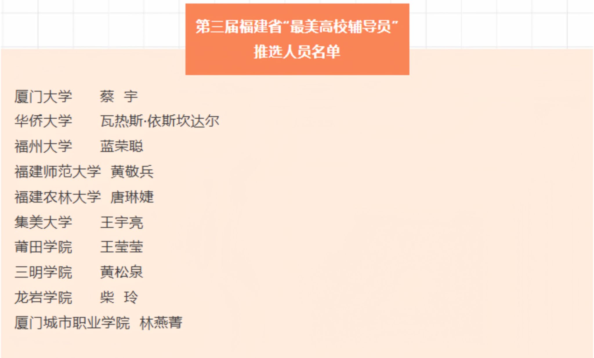 第三届福建省“最美高校辅导员”宣传选树活动,由省委宣传部、省委教育工委联合组织开展。在学校推荐、专家评审的基础上,本届共推选出10名“最美高校辅导员”。