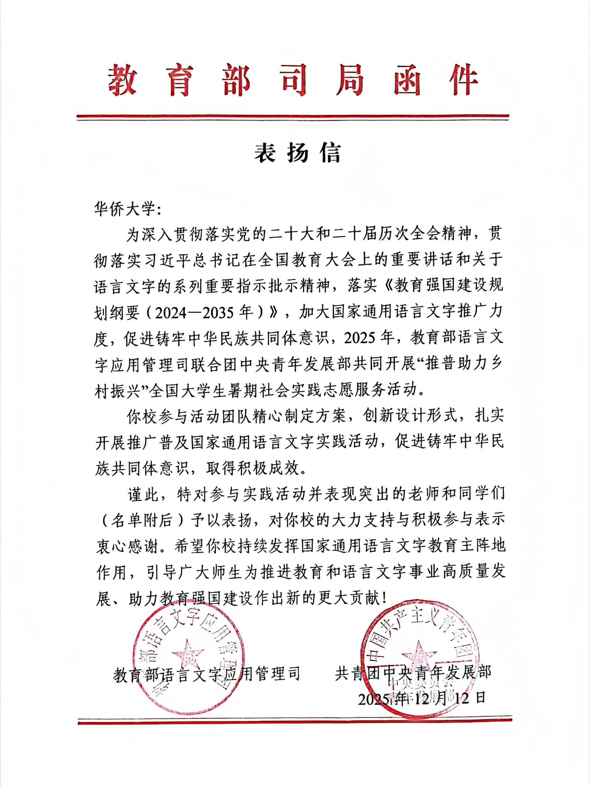 近日,在教育部语言文字应用管理司、共青团中央青年发展部联合开展的2025年“推普助力乡村振兴”全国大学生暑期社会实践志愿服务活动中,华侨大学第十八届甘肃积石山支教团从全国2000支入选队伍中脱颖而出,获评“优秀团队”称号,教育部语言文字应用管理司和共青团中央青年发展部来信表扬。