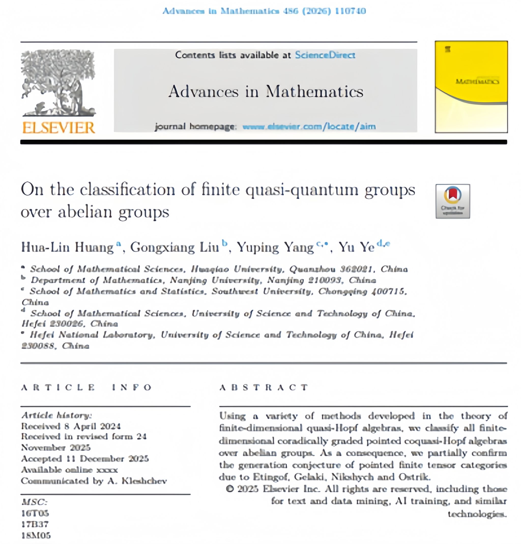 近日,华侨大学数学科学学院黄华林教授与合作者在国际顶尖数学期刊《数学进展》(Advances in Mathematics)上发表了最新研究成果On the classification offinitequasi-quantum groups over abelian groups。