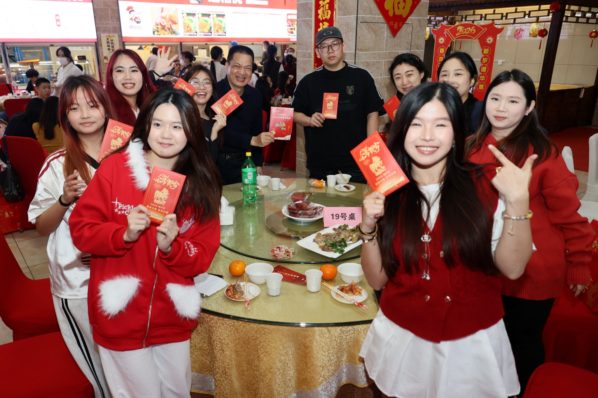 除了丰盛的团圆饭,华侨大学校领导徐西鹏、吴剑平、王秀勇、何纯正、黄辉、缑锦等还现场向学生们派发了压岁钱,向留校师生致以新春的美好祝福。接过象征吉祥如意、前程似锦的红包,学生们纷纷合影留念,将这份新春喜悦分享给远方的家人和朋友。