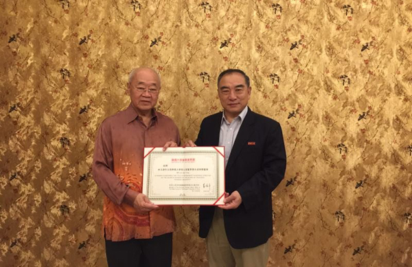 贾益民为林玉唐颁发华侨大学董事会永远荣誉董事聘书