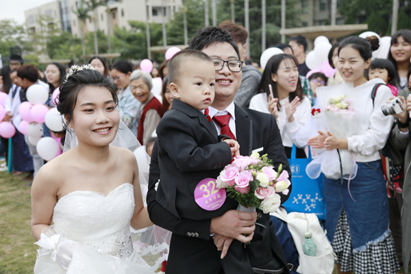 魏志坚和周怀敏分别是我校工商管理学院2000届、旅游学院2002届的校友。这天,他们带着已有10岁的可爱儿子回到母校参加婚礼。“我们认识17年,结婚11年了。借着这次集体婚礼的机会,我们想回母校看看。”