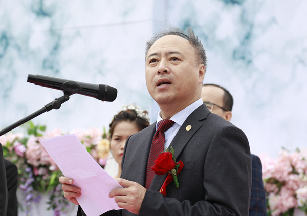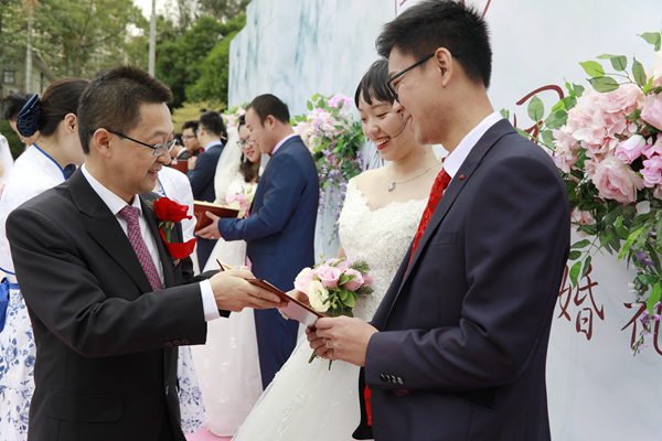 “感谢你们将最宝贵的青春、最浪漫的爱情和最温暖的回忆赠予母校,母校的历史因为有你们的故事而更加绚丽多彩。”校长徐西鹏为新人证婚并致辞:“愿你们在今后的日子里都能聚沙成世界,滴水汇汪洋,用每一刻的坚持连成最长久的爱情,用每一分的包容筑成最稳固的幸福!母校永远是你们最温暖的家园!”他衷心祝愿新人们在人生的旅途中幸福美满、永结同心。