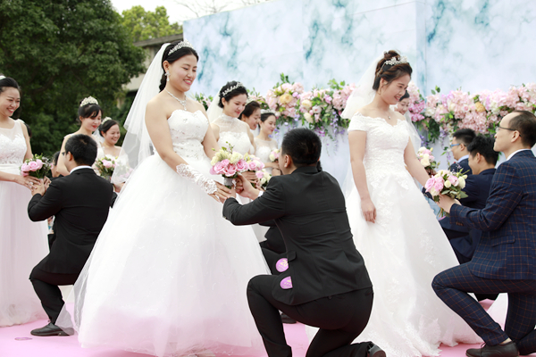 今年的婚礼采用西式的草坪婚礼形式,求婚、宣誓与交换戒指浪漫上演,全体新人在彼此的深情对望与幸福的笑容中许下爱的誓言:“我们会在母校见证下,一生一世风雨同舟永远相伴,互敬互爱共创美好未来。”在热情的师生簇拥下,新娘们集体抛出婚礼花球,将全场气氛引向最高点。