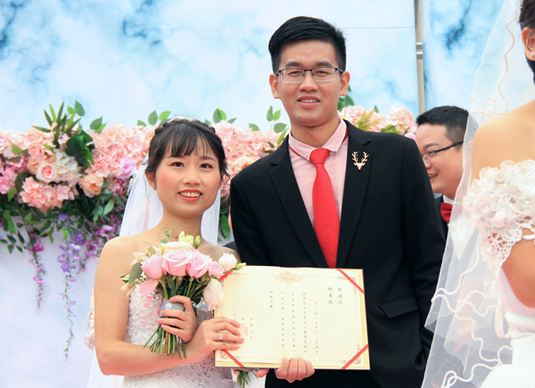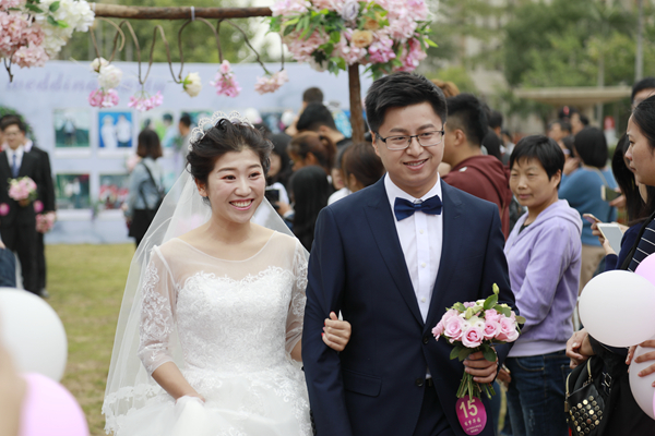 “我今年刚毕业。”新闻与传播学院2017届校友李萌雨面带幸福地微笑,分享自己的故事:“我和我先生是高中校友,我们恋爱五年,异地四年,但这没有让我们生疏,反而让我们之间的感情更加坚固。我们说好了一毕业就结婚,所以,现在他陪我回到母校,一起来参加这场校友集体婚礼。”