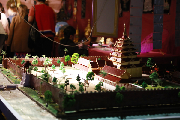 进入缅甸文化展的现场,首先映入眼帘的是烟雾袅绕的情人桥,许多同学被这座独特的柚木桥吸引,久久驻足观看。据介绍,这是仿照缅甸一座著名的道德湖情人桥所搭建,是世界上最长的柚木桥,经数百年而不朽。