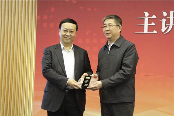 关一凡为高培勇颁发“华大讲堂”主讲嘉宾纪念牌