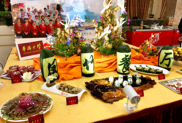 除了学生带来的独具特色的海丝美食,本次活动的专业团队也向全校师生展示了别样风采,平时在幕后工作的食堂大厨纷纷各显神通,有的团队摆出了“姜山”,有的团队用芋头雕出栩栩如生的华大校门。最终,北京大学、厦门大学、太原理工大学和东华大学获得本次美食博览会校外专业组经典美食金奖。