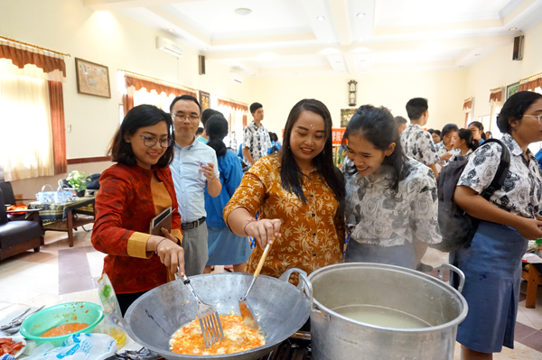 “剪一张中国元素的窗花、做一桌香喷喷的团圆饭、吃一碗热腾腾的自制手工水饺、写一副中国书法春联、赏一台学生自导自演的中文节目……”印度尼西亚留学生李伟汉讲述了团队寒假期间到印度尼西亚巴厘岛的新加拉惹巴厘陵国立第一高中的实践故事。队员创新海外春节文化的讲述和传播方式,将春节故事带到课堂上,让印度尼西亚边远地区学生近距离体验了一把别具特色的“中国年”。队员还鼓励学生将学会的中国手工窗花剪纸和红包灯笼带回家,与父母分享中国春节故事。
