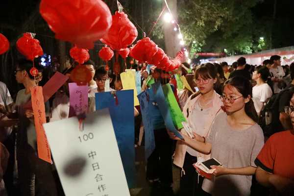 此外,秋中湖边、华园大道以及金川活动中心等地,猜灯谜、投壶、泡茶、剪纸、书法、雕刻、画脸谱等38个文化体验互动的小“门店”前欢声笑语、人声鼎沸。同学们有的手拿数张灯谜,绞尽脑汁;有的细致认真地在纸伞、面具上作画;更多的是好奇地在各处张望,了解各式各样的传统技艺。