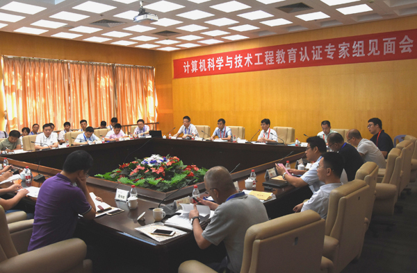计算机科学与技术学院相关负责人作本专业认证工作的基本情况汇报,对自评报告作补充说明。各位专家并结合专业自评报告中的内容进行现场提问,相关职能部门、学院和专业负责人针对专家提出的问题进行解答。
