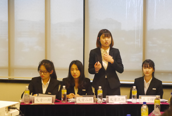 按照赛程,在积分赛中,我校文学院辩论队作为反方,分别与马来西亚北方大学、马来西亚马来亚大学围绕“人工智能的研究应/不应该有伦理界限”和“美国应/不应该重回跨太平洋伙伴关系协定”两个辩题进行论战。双方你来我往,金句频出,最终文学院辩论队凭借积分赛票数优势,成功晋级决赛。