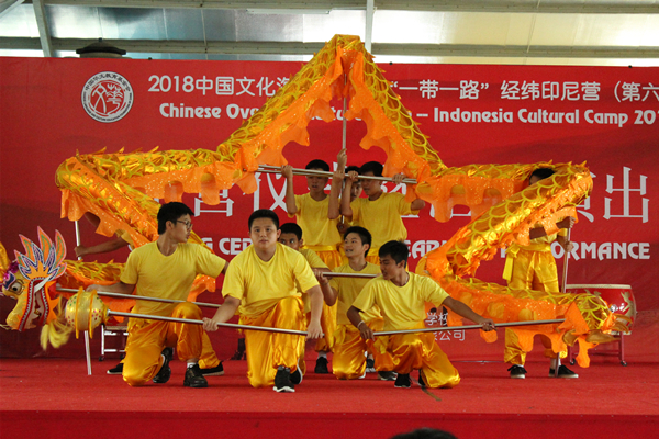 8月30日,由中国华文教育基金会主办,华侨大学承办,印尼文桥三语学校协办,中国经纬置地有限公司资助的2018中国文化海外行——“一带一路”经纬印尼营闭营仪式暨汇报演出在文桥三语学校礼堂举行。中国驻登巴萨总领事馆副总领事陈巍、副领事秦为芬出席仪式,华侨大学教师团队,文桥三语学校的创办人江连福、董事长江睿、顾问王天发和社团代表,以及文桥学校师生300多人共同观看了演出。