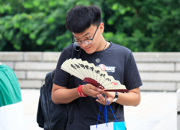 法学院今年为新生准备了印有院训“崇法明理 厚德致公”的折扇,每一把扇子均由学号作为编号,上面的书法题字均由学生和老师书写。