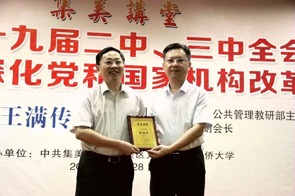 9月28日上午,由华侨大学和集美区委、区政府联合主办的高端学术文化讲坛“集美讲堂”举行第19讲,邀请中共中央党校(国家行政学院)公共管理教研部主任、中国行政体制改革研究会副会长王满传教授作专题报告。