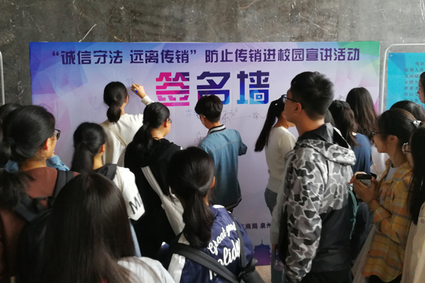 活动中,泉州市打击传销工作领导小组相关负责人介绍了传销的概念、特征、危害及常见的传销洗脑套路等知识,并通报了近年来全市防范打击传销工作开展情况和成效;学生们观看了“诚信守法,远离传销”专题图片展、学习“拒绝传销公开信”,并在签名墙上庄严地签下自己的名字,表达远离传销的决心;我校学生会主席王浛睿作为学生代表作反传销倡议发言。