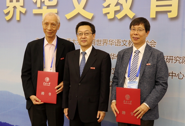 当天,北京大学陆俭明教授、北京语言大学原校长崔希亮教授受聘为华侨大学兼职教授,徐西鹏为其颁发聘书。