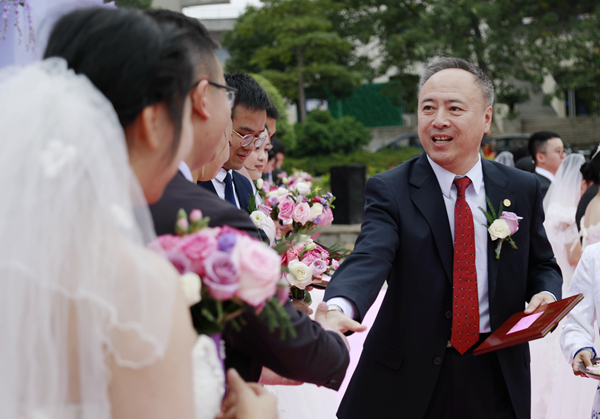 我校副校长、校友总会副会长曾路为新人证婚并致辞。“愿你们在今后的日子里都能聚沙成世界,滴水汇汪洋,用每一刻的坚持连成最长久的爱情,用每一分的包容筑成最稳固的幸福!母校永远是你们最温暖的家园!”他衷心祝愿新人们在人生的旅途中幸福美满、永结同心。“无论你们走向何方,母校都将执着地守望你们的幸福,期待你们归来!”