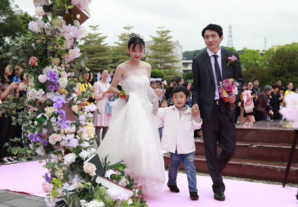 走过由鲜花和气球点衬着、洋溢着浪漫气息的粉色地毯,穿过精心布置的花门,一对对盛装加身的新人,或牵手、或挽依,在无数亲朋好友的祝福声中,依次走上婚礼的舞台。他们中有的从高中就开始爱情长跑;有毕业12年后,带着活泼可爱的孩子回来看望母校的三口之家;更有参加完集体婚礼,当天还要在母校举办个人婚礼的幸福新人。当新人走过花门,脸上洋溢的笑容总会激起现场热情的欢呼,现场师生纷纷拿出手机、相机,争相记录这浪漫幸福的画面。