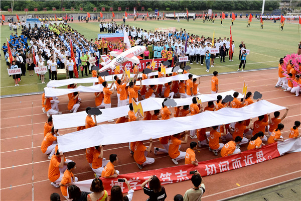 化工学院学生迈着整齐划一的步伐向主席台走来,六个“苯宝宝”手牵着手,连接成坚不可摧的“大苯环”,展现着“六大化工”的理念与思想;土木工程学院学生手举港珠澳大桥模型惊艳亮相,他们以此致敬大国工程,表达了土木工程学子的责任与担当;音乐舞蹈学院用《走进新时代》的歌舞表演,淋漓尽致地展现了朝气蓬勃的靓丽风姿;机电及自动化学院学生高举“飞机”模型霸气入场,“飞机”不惧风雨,凌云直上,展现了机电人攻坚克难的毅力与为祖国工业事业奉献青春的决心。首次在厦门校区亮相的机关工会(厦门)代表队压轴出场,凭借舞蹈《燃烧我的卡路里》点燃全场……