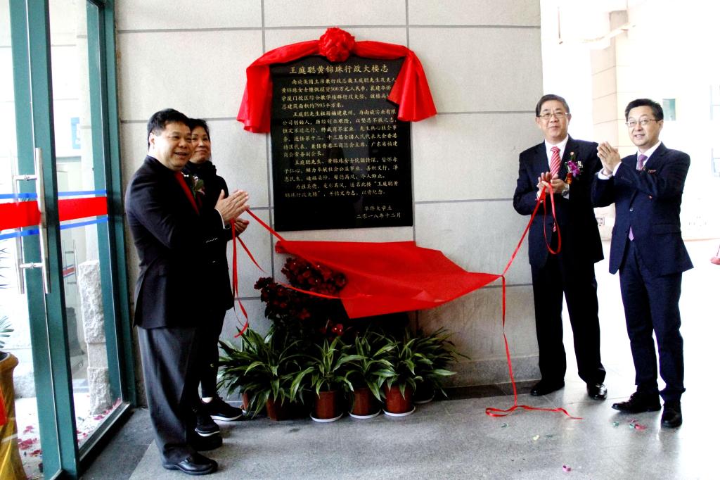 王庭聪、黄锦珠、关一凡、徐西鹏并为王庭聪黄锦珠行政大楼楼志揭幕。