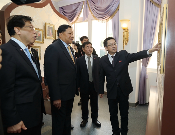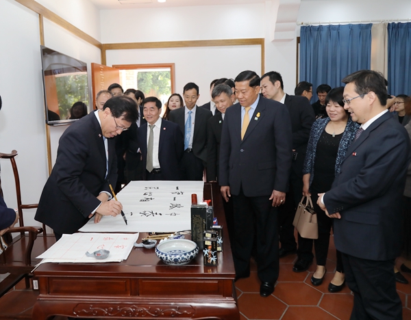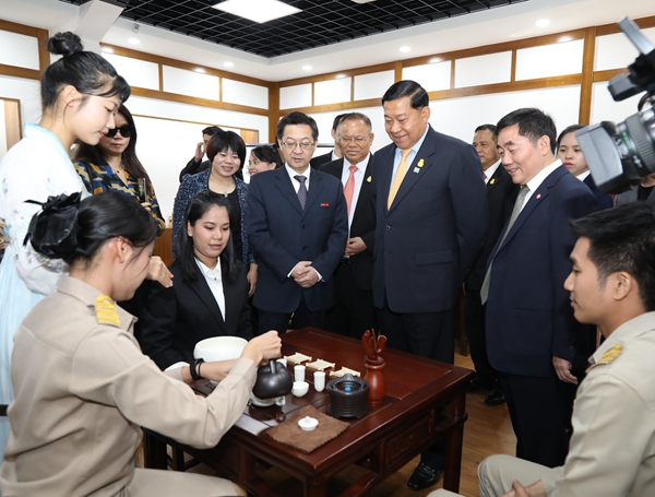 在校长徐西鹏陪同下,代表团一行到访我校华文学院,参观诗琳通图书馆,听取泰国留学生在校学习生活情况介绍,走进中国书法、剪纸、茶艺、古筝、舞蹈等中华传统文化课堂,体验中华文化。