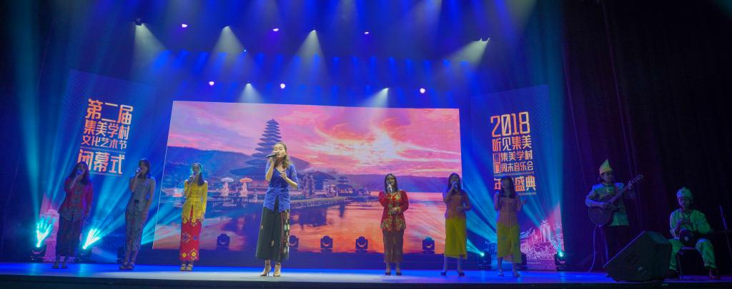 在1月5日晚的艺术节闭幕式现场,我校音乐舞蹈学院带来了混声合唱《厦门亲像一首歌》、歌伴舞《集美夜色美》等精彩节目。我校华文学院8名来自印度尼西亚的学生共同演唱歌曲《哎呦妈妈》,欢快的歌声感染了大批观众。