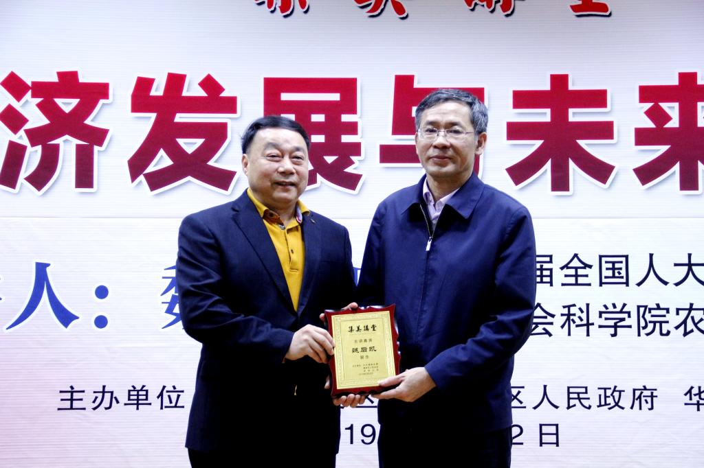 集美区人大常委会主任陈建荣为魏后凯颁发“集美讲堂”主讲嘉宾纪念牌。华侨大学党委副书记刘斌主持报告会。