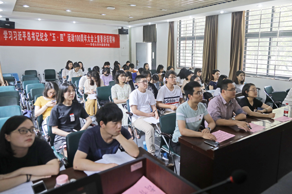 “习近平总书记的讲话指出了五四运动的精神内涵,即爱国、进步、民主、科学,而其核心是爱国主义。”哲学与社会发展学院党委书记薛秀军指出,五四运动改变了以往只有觉悟的革命者而缺少觉醒的人民大众的斗争状况,实现了中国人民和中华民族自鸦片战争以来的第一次全面觉醒。以五四运动为标志,中国的现代国家意识和民族意识得以塑造,以爱国主义为伟大旗帜,中国人民和中华民族实现了深刻的自觉和广泛的团结,并逐步塑造和形成了其根本的领导力量——中国共产党。“从此,中国历史掀开了崭新一页,中国人民和中华民族在改造中国、改造世界的拼搏中迸发出了排山倒海的历史伟力!”