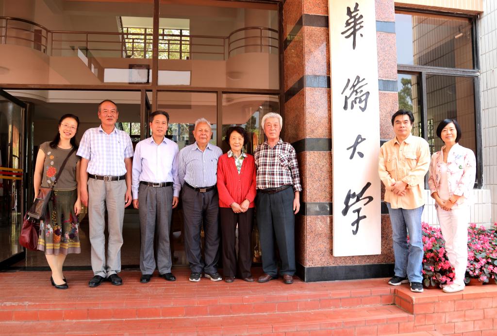 校党委副书记毕明强与谢冕(左四)在华侨大学校牌前合影