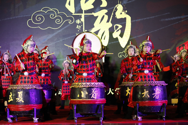华侨大学泉州校区二十四节令鼓队新生队员带来节目《盛》。点开盛世的是独鼓演奏,一点一点、一层一层晕开的鼓点,就像祖国渐渐在东方崛起的开端。高潮部分慷慨激昂,急促密集的鼓点,急转蜿蜒,代表着祖国如巨龙腾空觉醒的繁盛。
