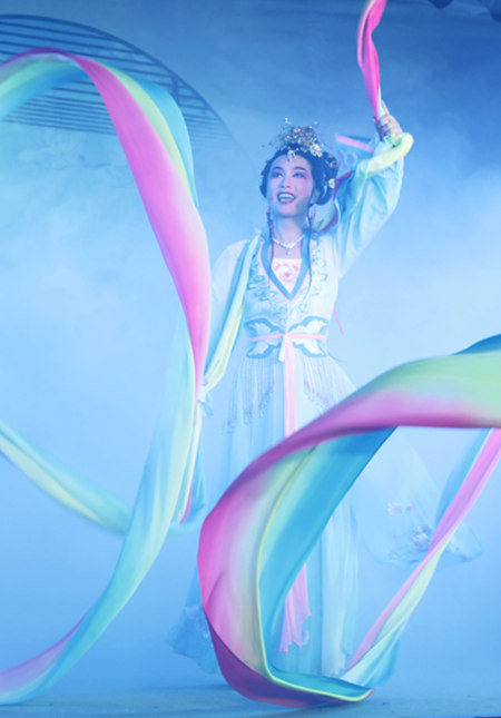 舞台上烟雾缭绕,天女裙裾飘逸,体态轻盈。越剧折子戏《天女散花》改编自京剧,是京剧大师梅兰芳的代表作。以“云路”和“散花”为核心,用戏曲武戏的基本功,舞动长绸,展现仙女之美。剧中唱词由慢而快,身段和长绸舞亦是由慢而快。“波浪花”“双对花”等绸花样式烘托出天女御风而行的轻灵神韵。