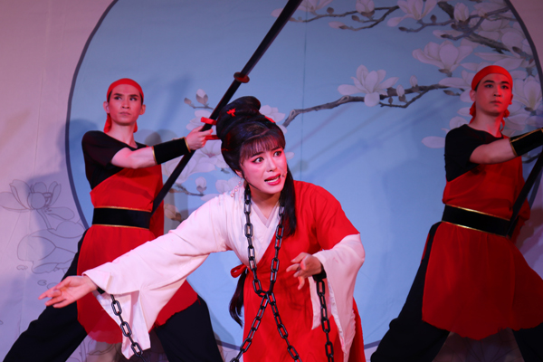 在一阵急促而有力的锣鼓声中,取材于明代传奇小说《杨家将演义》的越剧折子戏《三岔口》表演拉开了序幕。一系列高难度的跳跃及翻转赢得现场观众的热烈掌声。诙谐夸张的演绎方法充满戏剧艺术的张力,由此带来的喜剧效果更引得观众笑声不断。