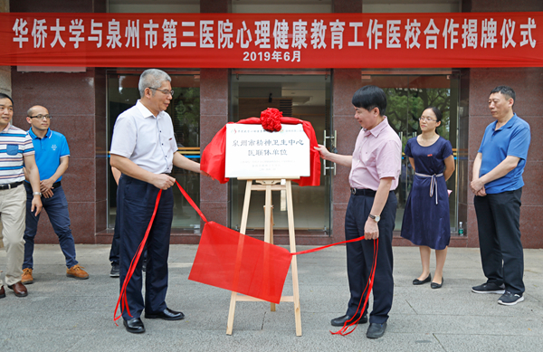 医校合作揭牌仪式于6月5日和6日分别在泉州校区、厦门校区举行。我校党委副书记刘斌分别与泉州市第三医院副院长王进义、厦门市仙岳医院院长王文强为我校成为“泉州市精神卫生中心医联体单位”“厦门市仙岳医院心理健康工作协作单位”揭牌。