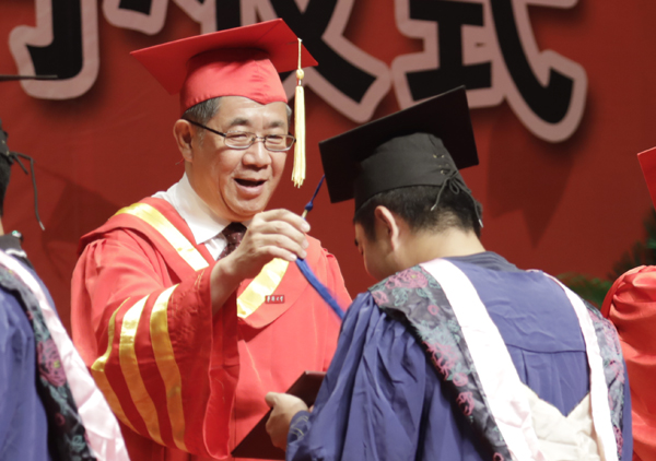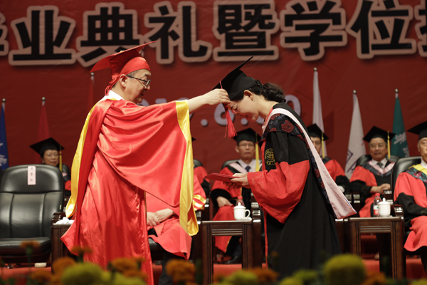 主礼嘉宾为毕业生拨穗并颁发学位证书