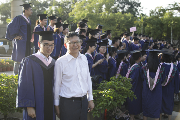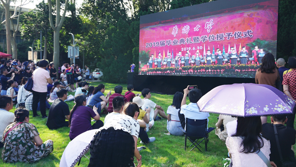 “我和我的祖国,一刻也不能分割……”毕业典礼前,几位在校生用歌声为即将毕业的学长学姐暖场,获得了大家热烈的回应。2017级的香港学生陆献钦不仅参与了《我和我的祖国》的合唱,也带来了一首耳熟能详的粤语歌曲。“多元文化的交流融合就是华大最重要的特色,所以我们加入了粤语演唱,让表演内容更加丰富。”他说。