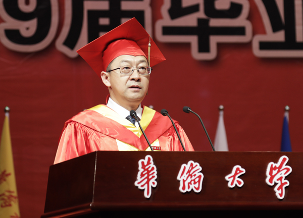 “希望你们有迎难而上的勇气,有爱拼敢赢的信心;希望你们秉持敢为人先的信念,以不假外求的态度,寻找自我价值;希望你们有修身立德、奉献他人的品质;希望你们怀有谦卑的心态,学会在不同文化中悠游自处;希望你们能有时代引领者的理想与担当,从历史的需要中看见自己的责任。”校长徐西鹏以《敢担历史使命 勇立时代潮头》为题致辞,勉励毕业生们始终保持追求卓越的脚步,传承荣校强国的使命,踏上前行的征途。“‘擦亮侨校金字招牌,吾辈义不容辞’,让我们与时代、与国家一起努力奔跑,做永远的追梦人!”